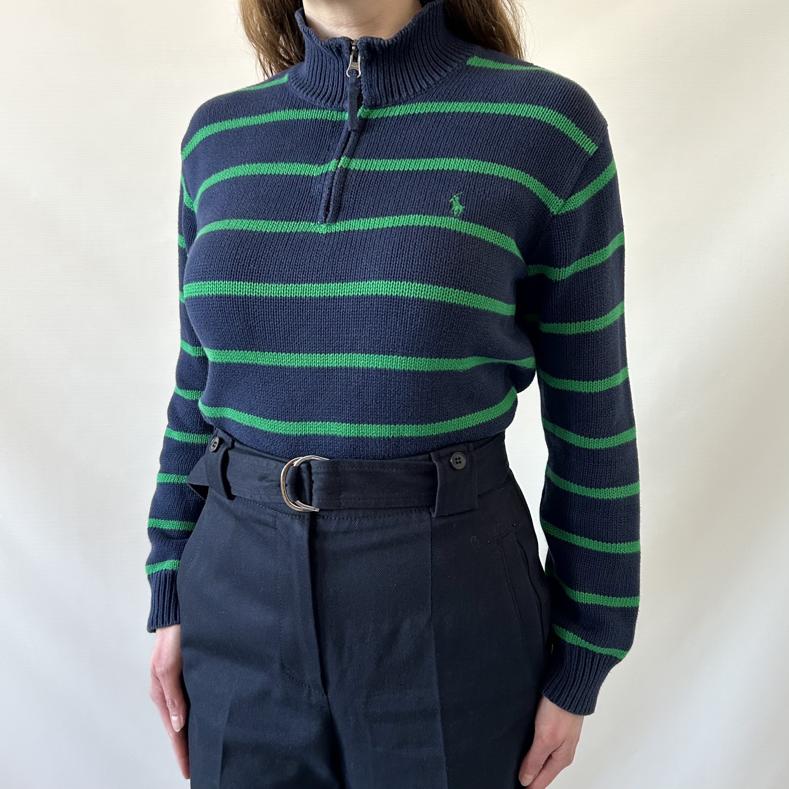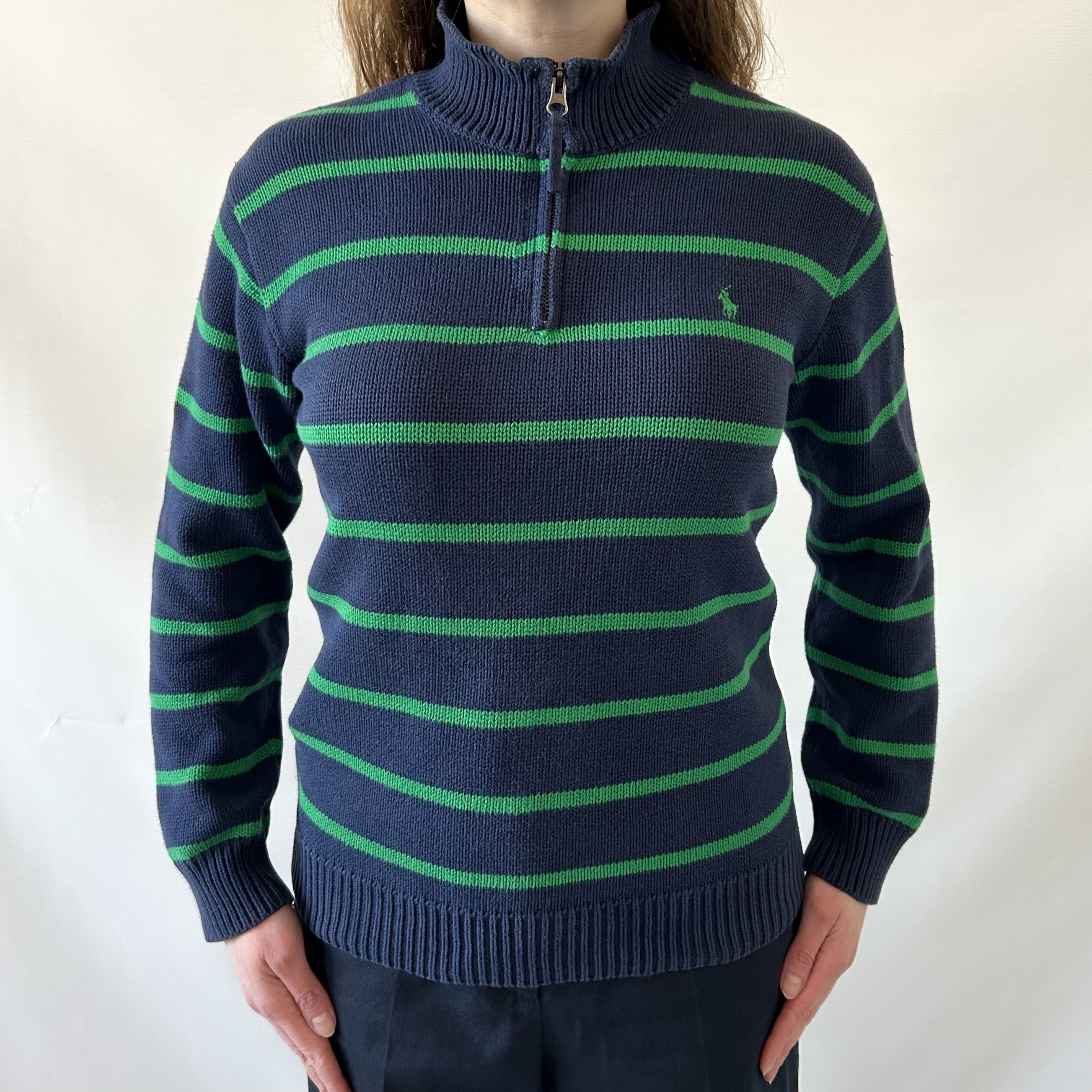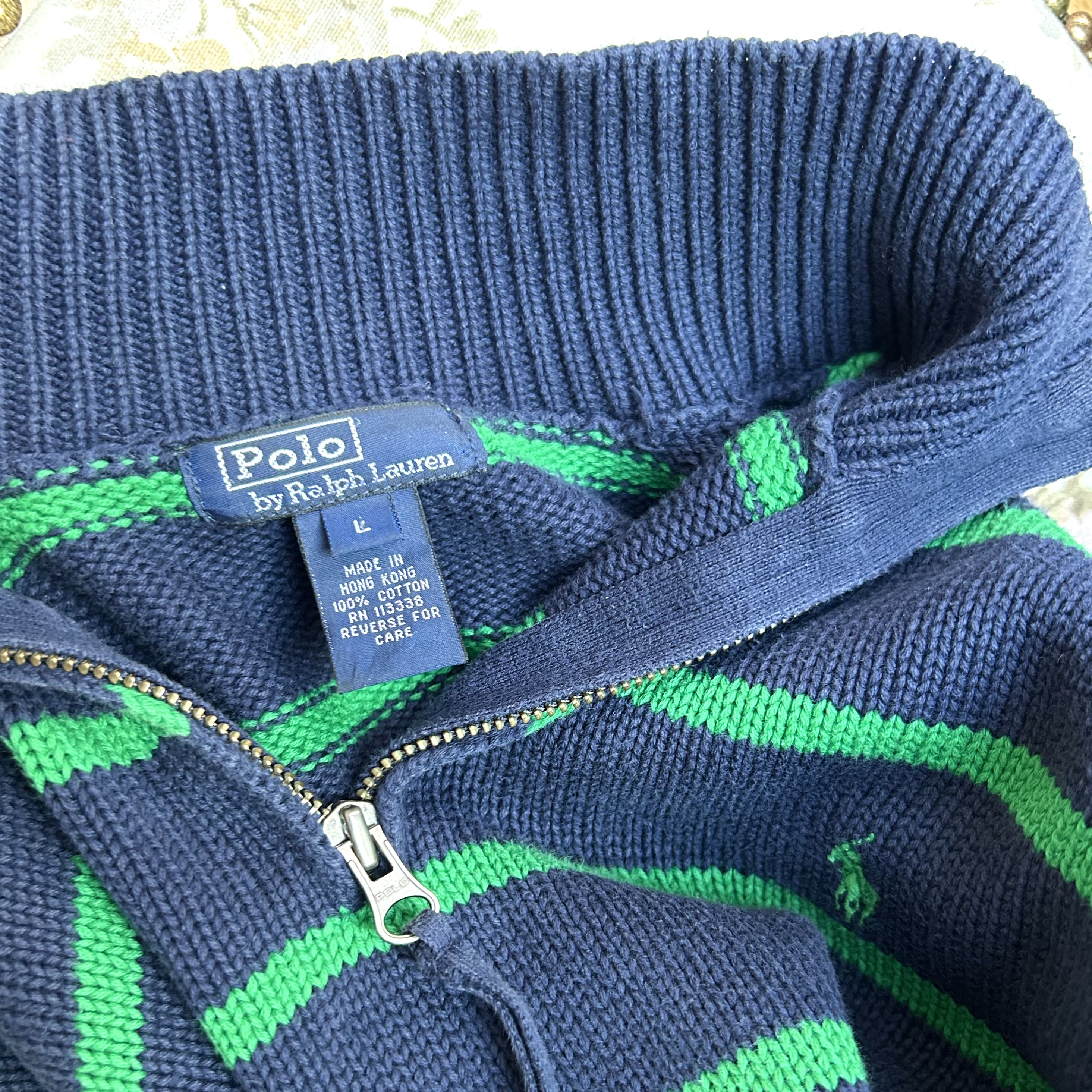 Granatowy sweter w zielone paski marki Ralph Lauren 100% bawełna Rozmiar L (proszę sprawdzić wymiary)