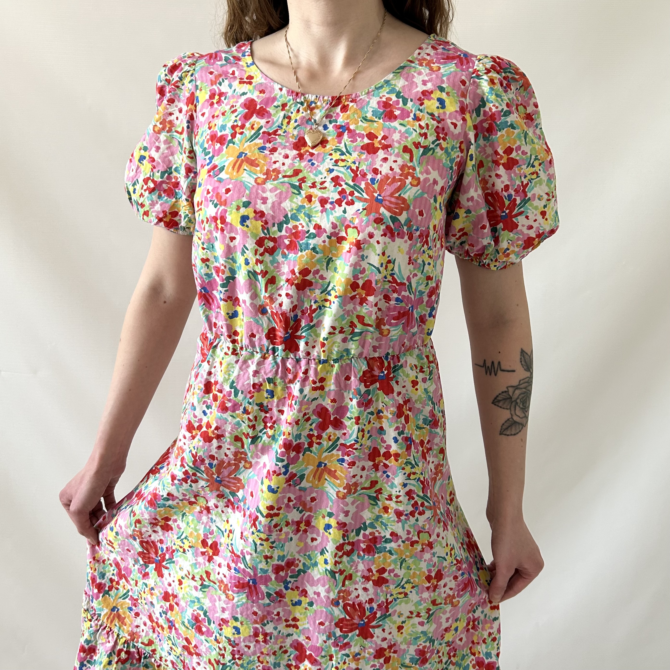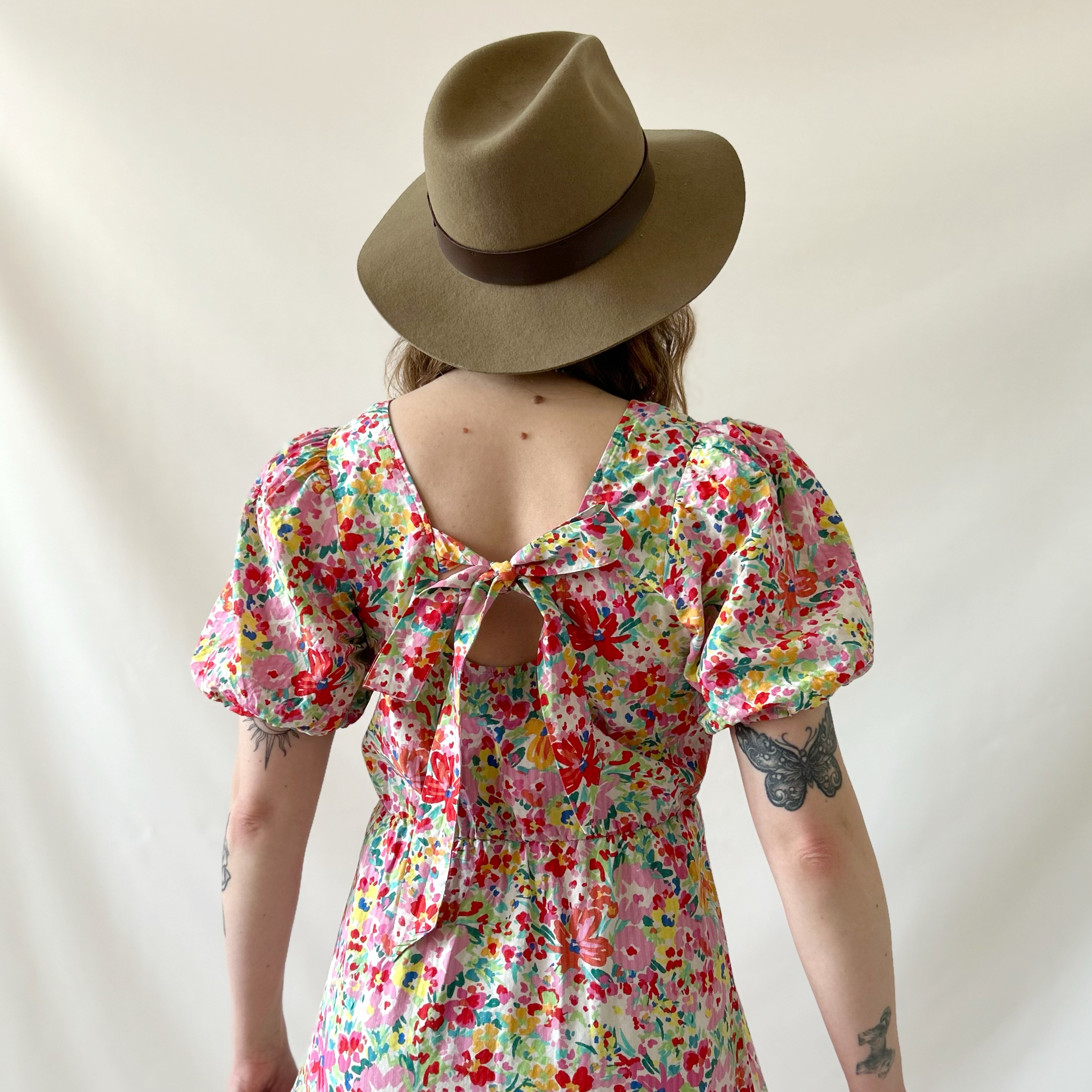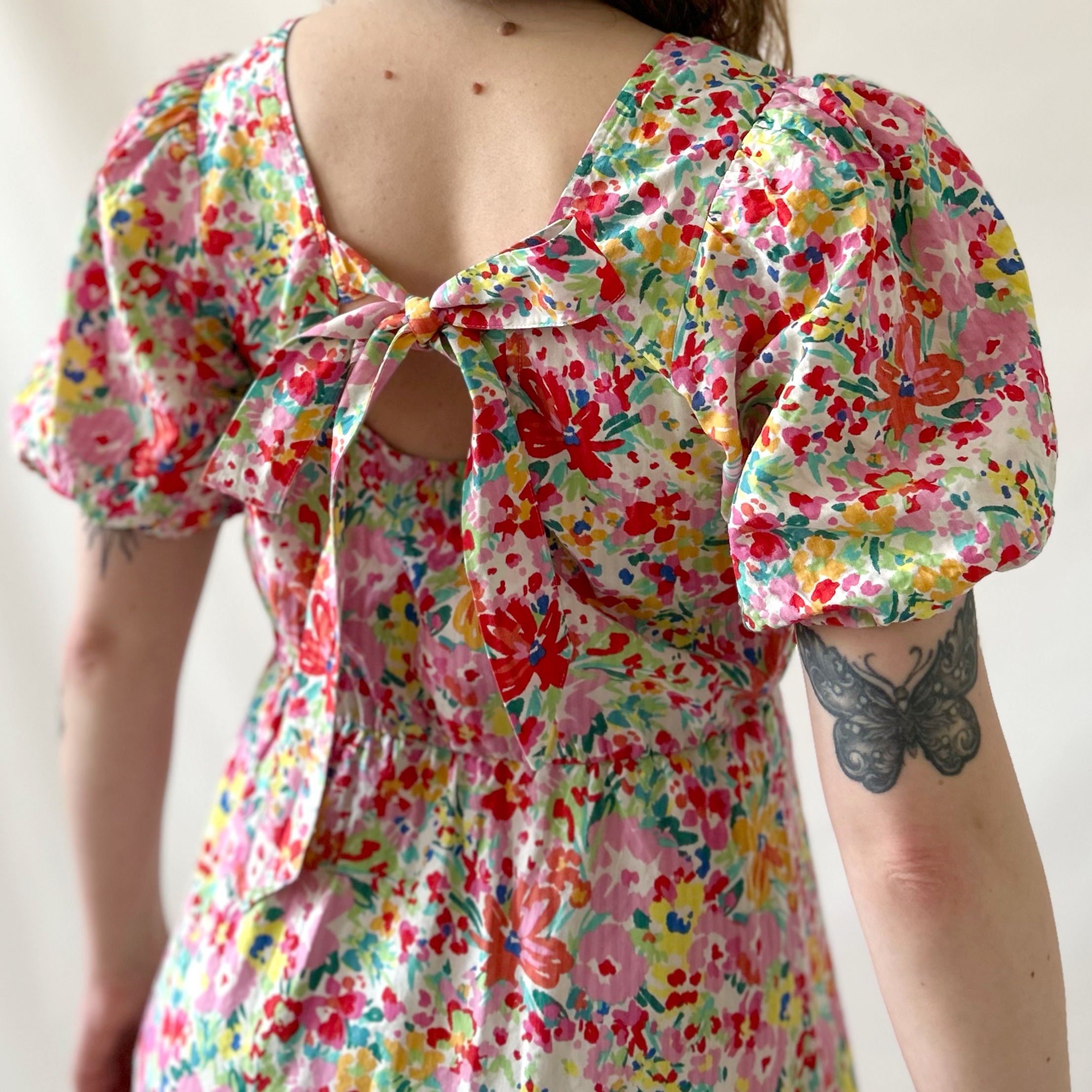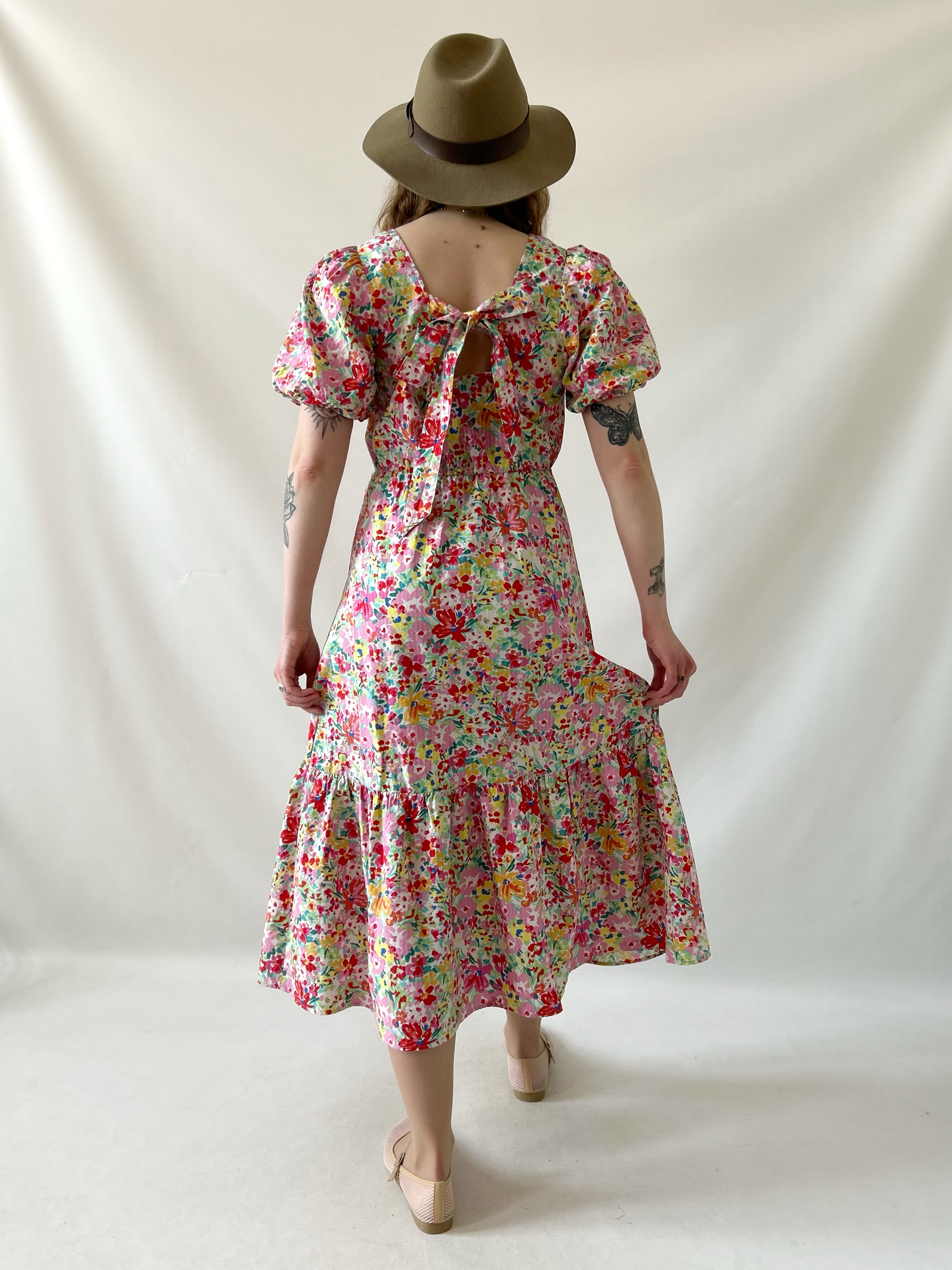Rozkloszowana retro sukienka w kolorowe kwiatki. Ma efektowne wiązanie na plecach