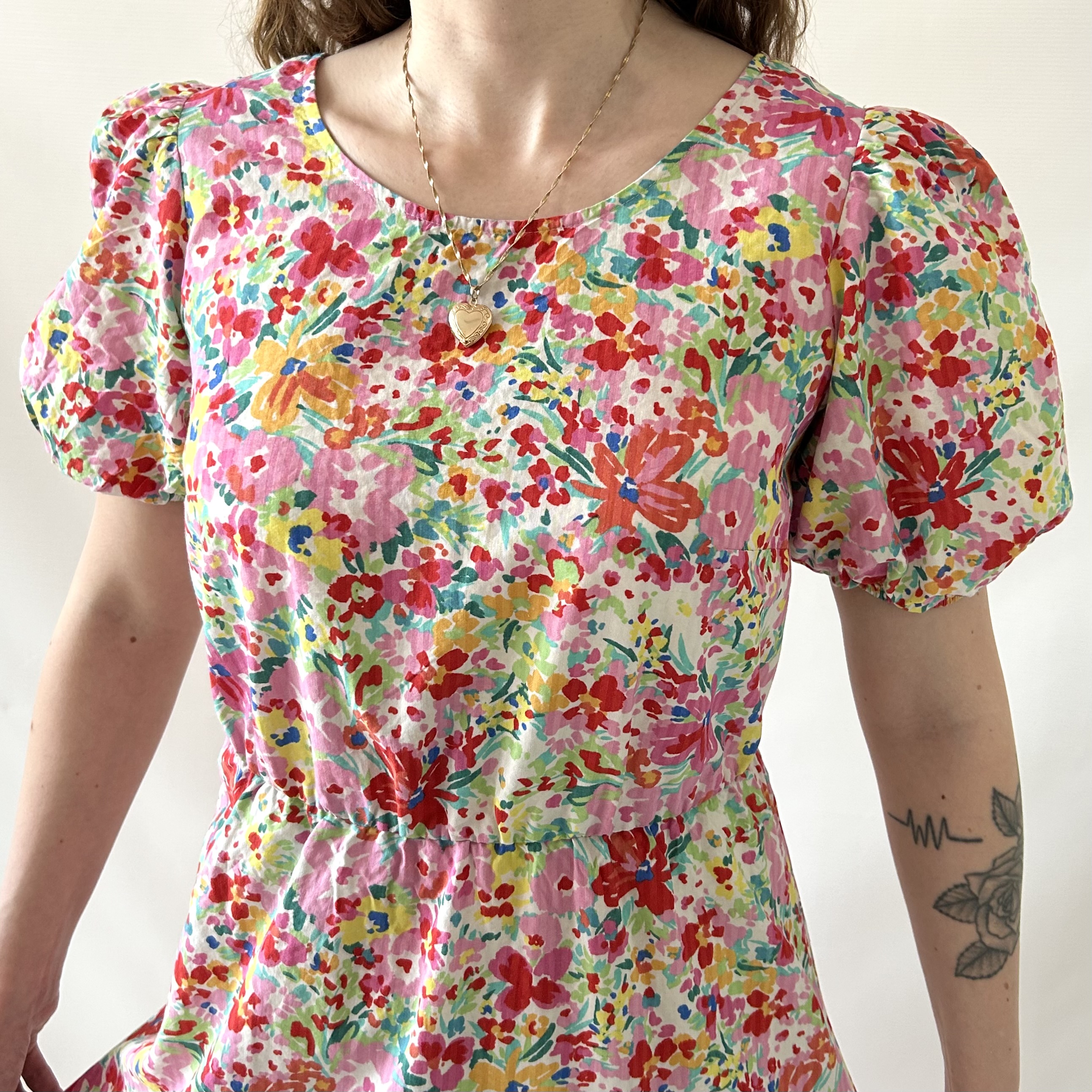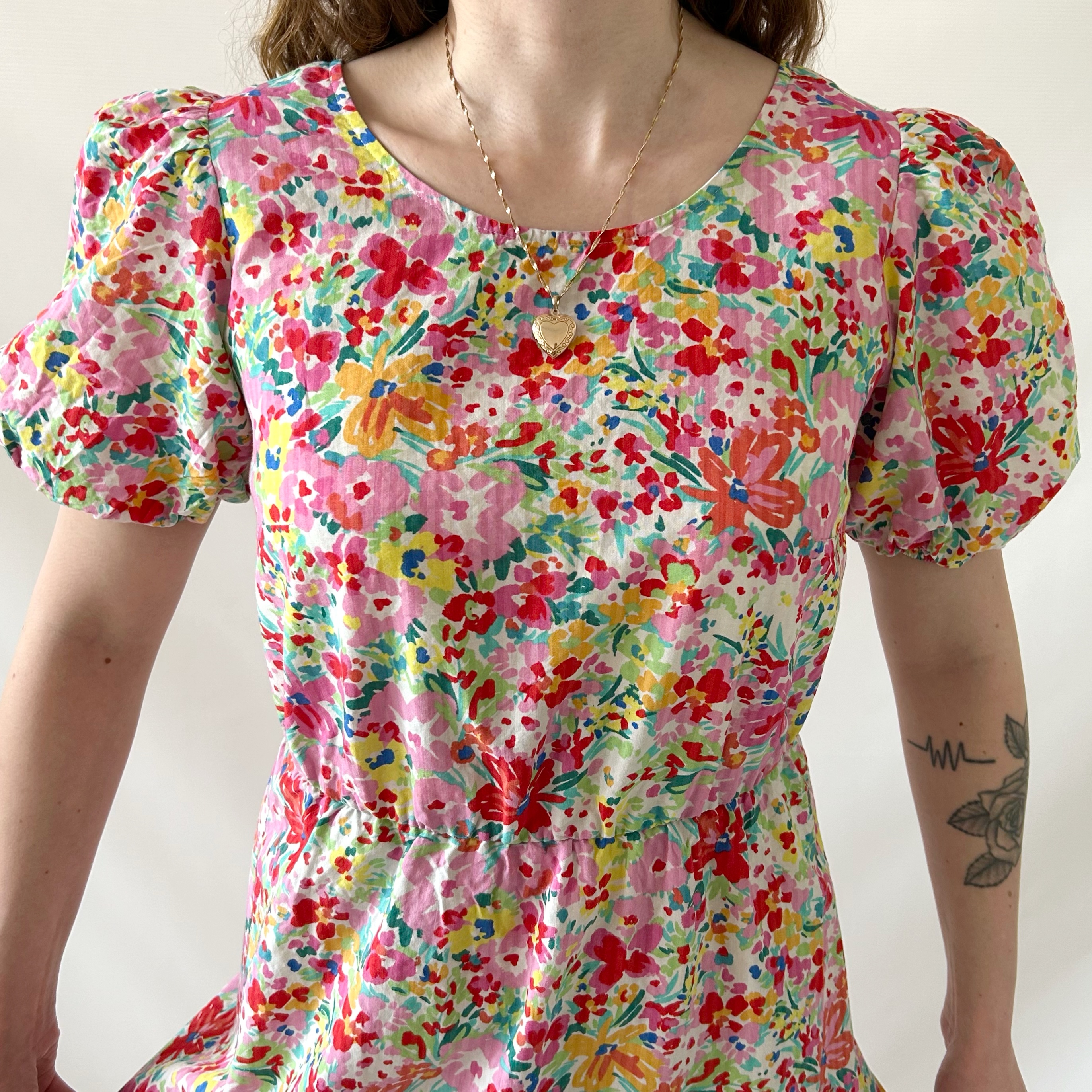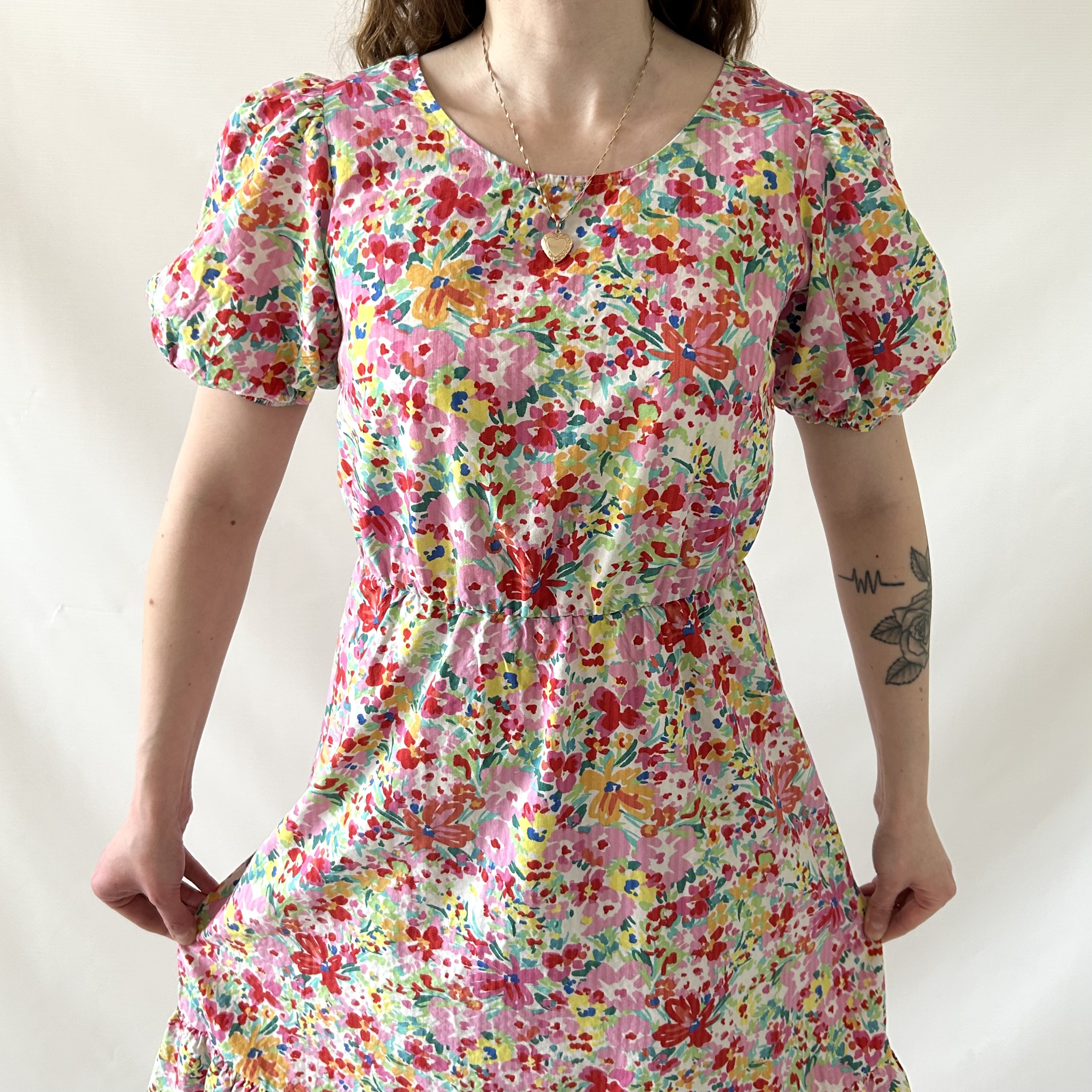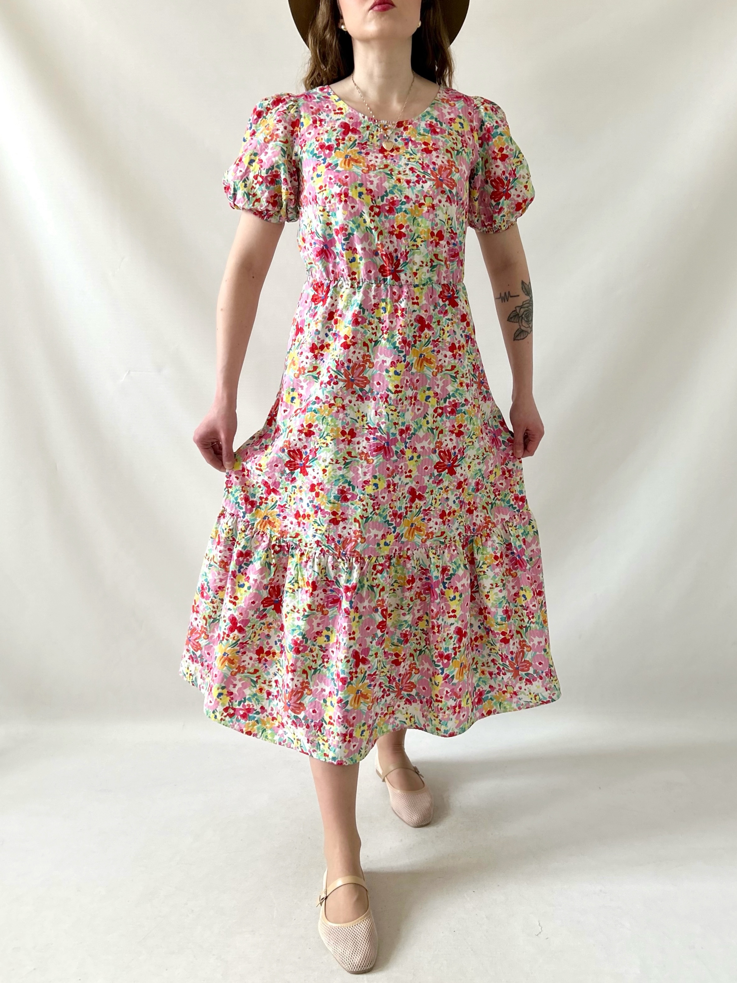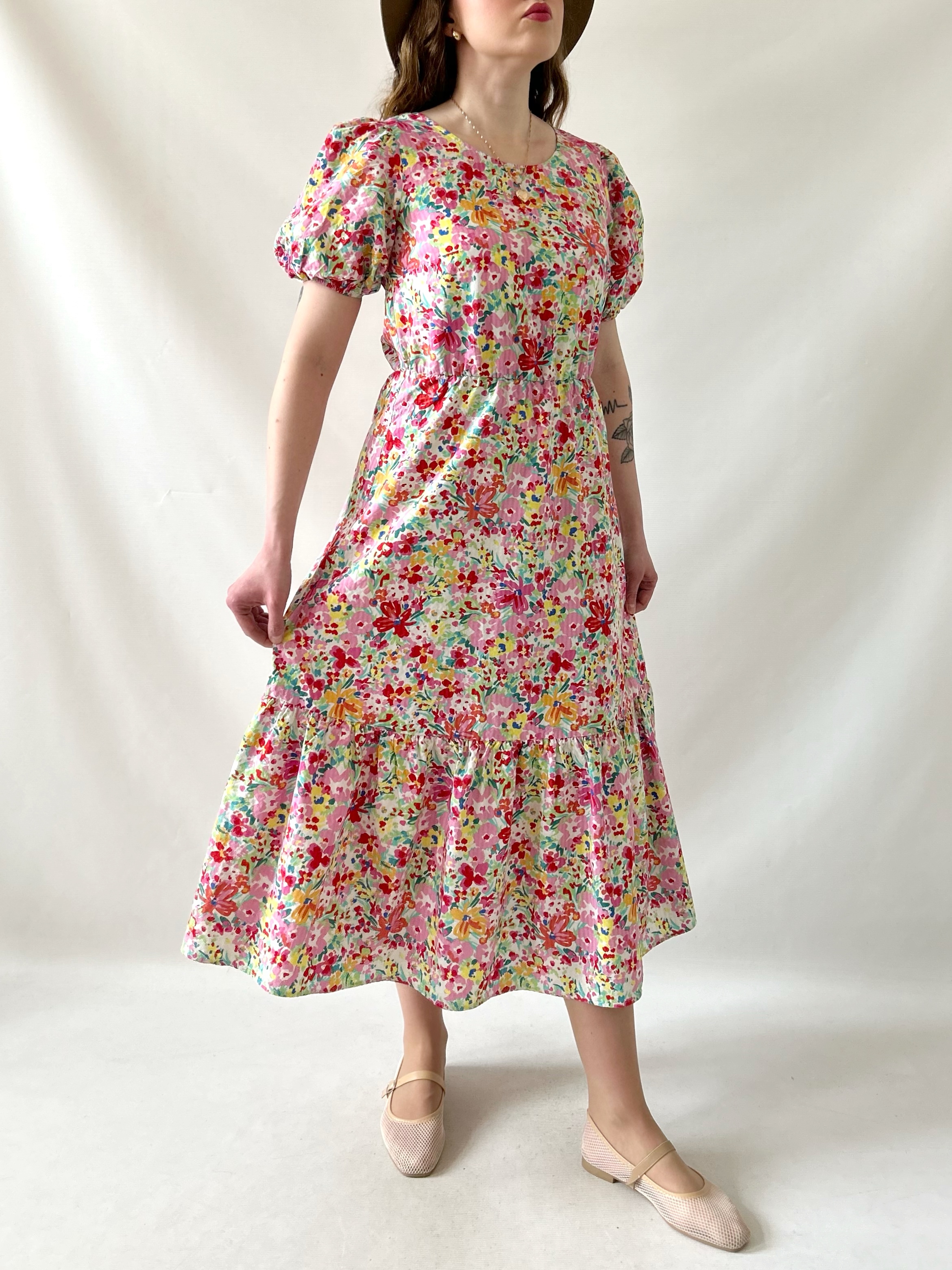 Rozkloszowana retro sukienka w kolorowe kwiatki. Ma efektowne wiązanie na plecach