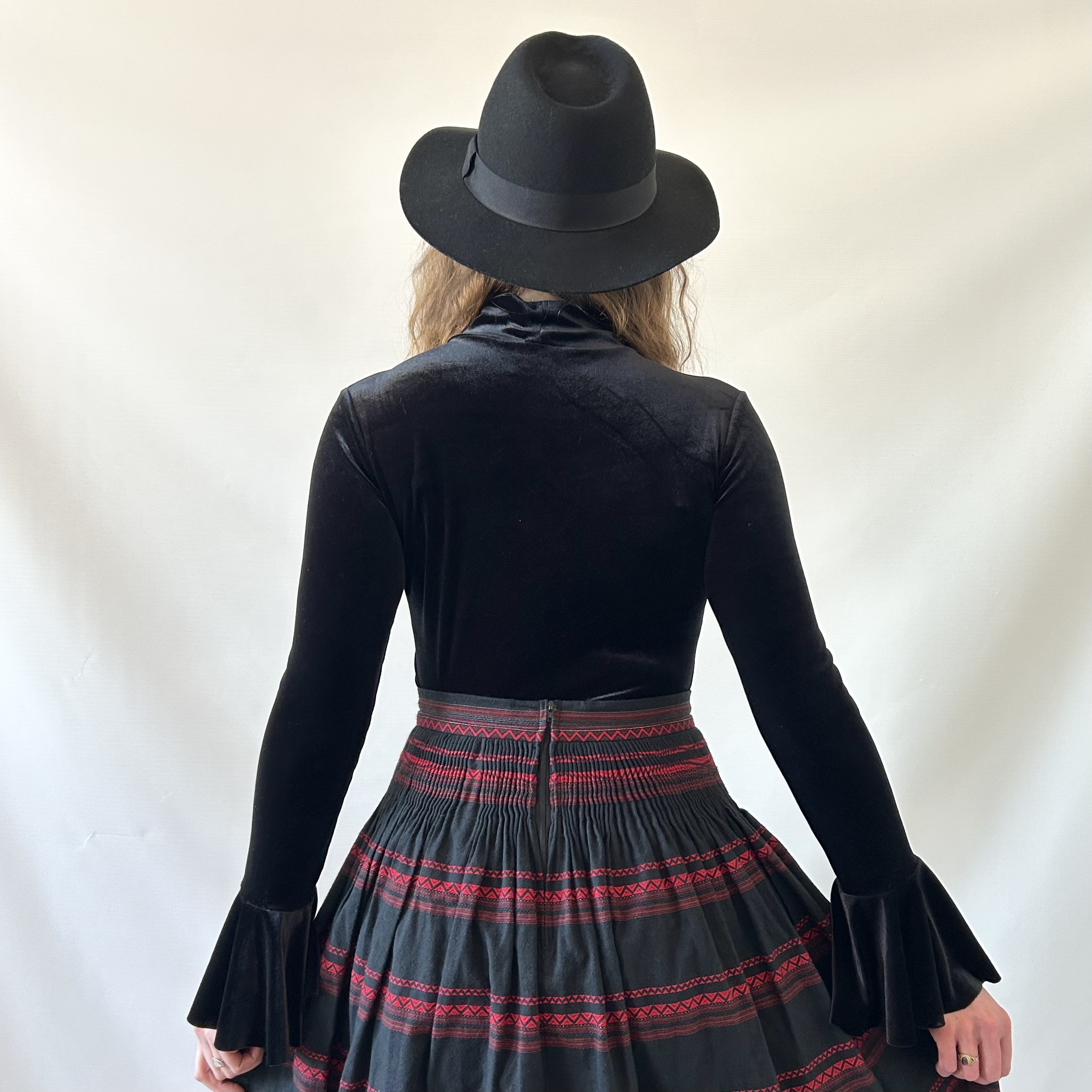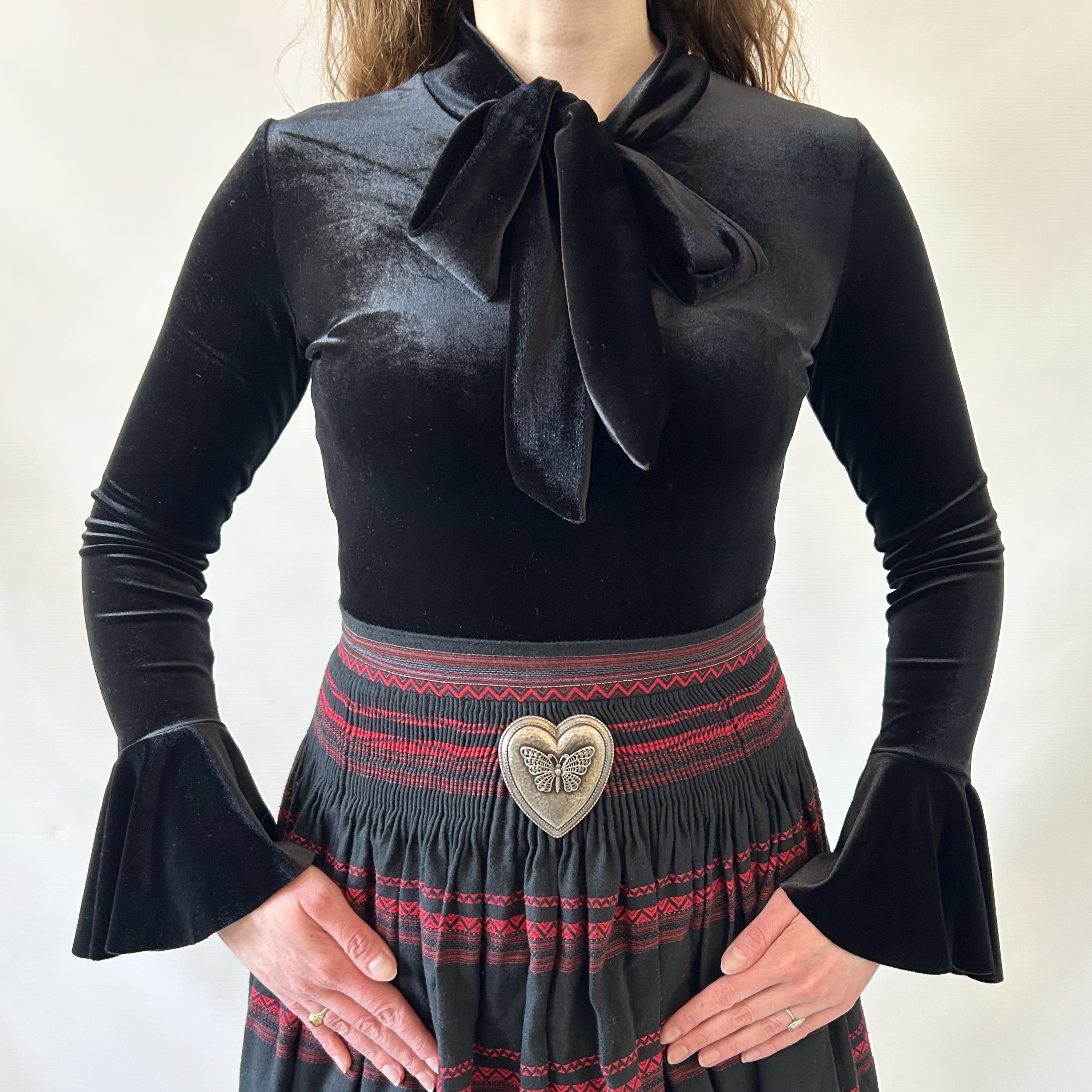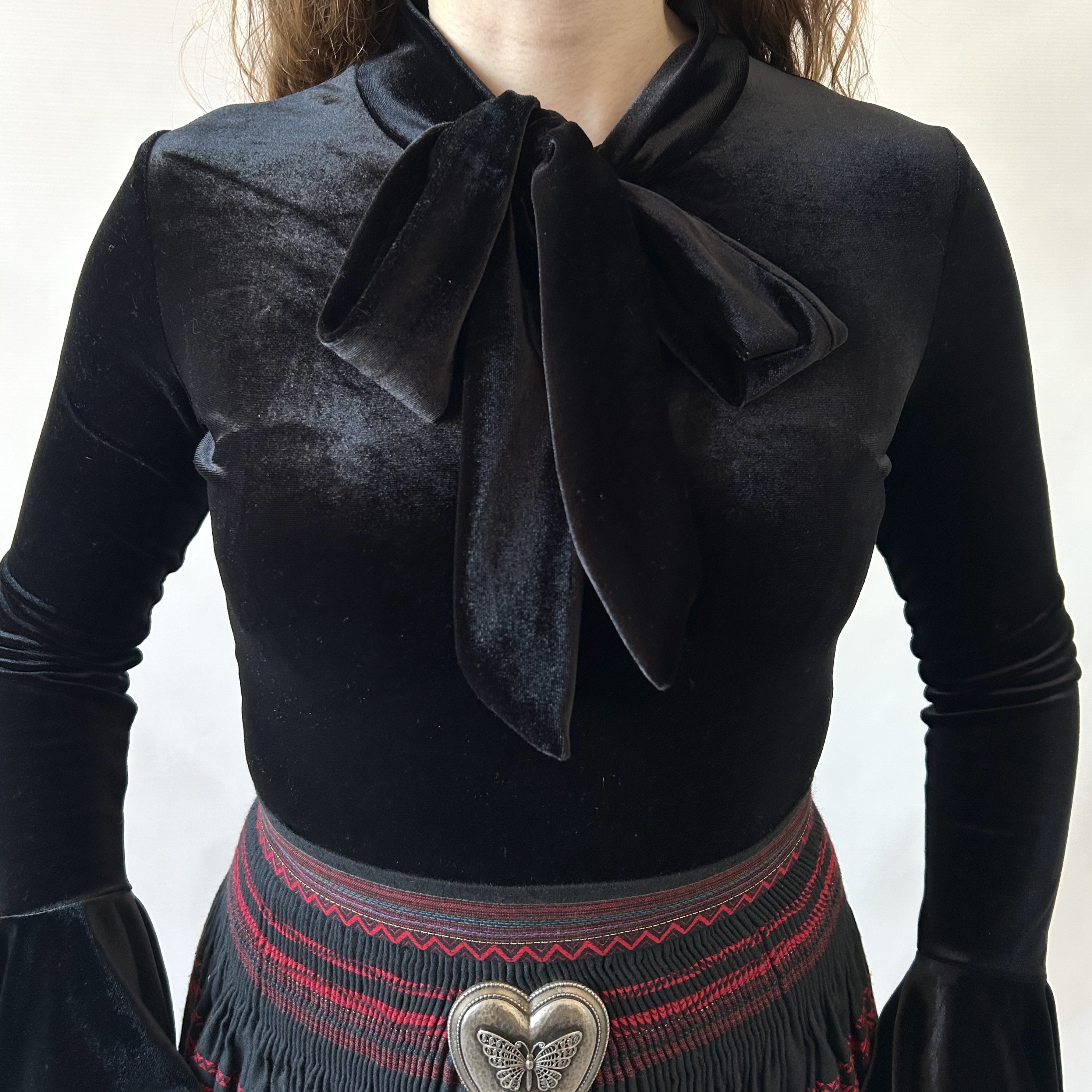 Aksamitna czarna bluzka z efektownymi rozkloszowanymi rękawami i wiązaniem pod szyją