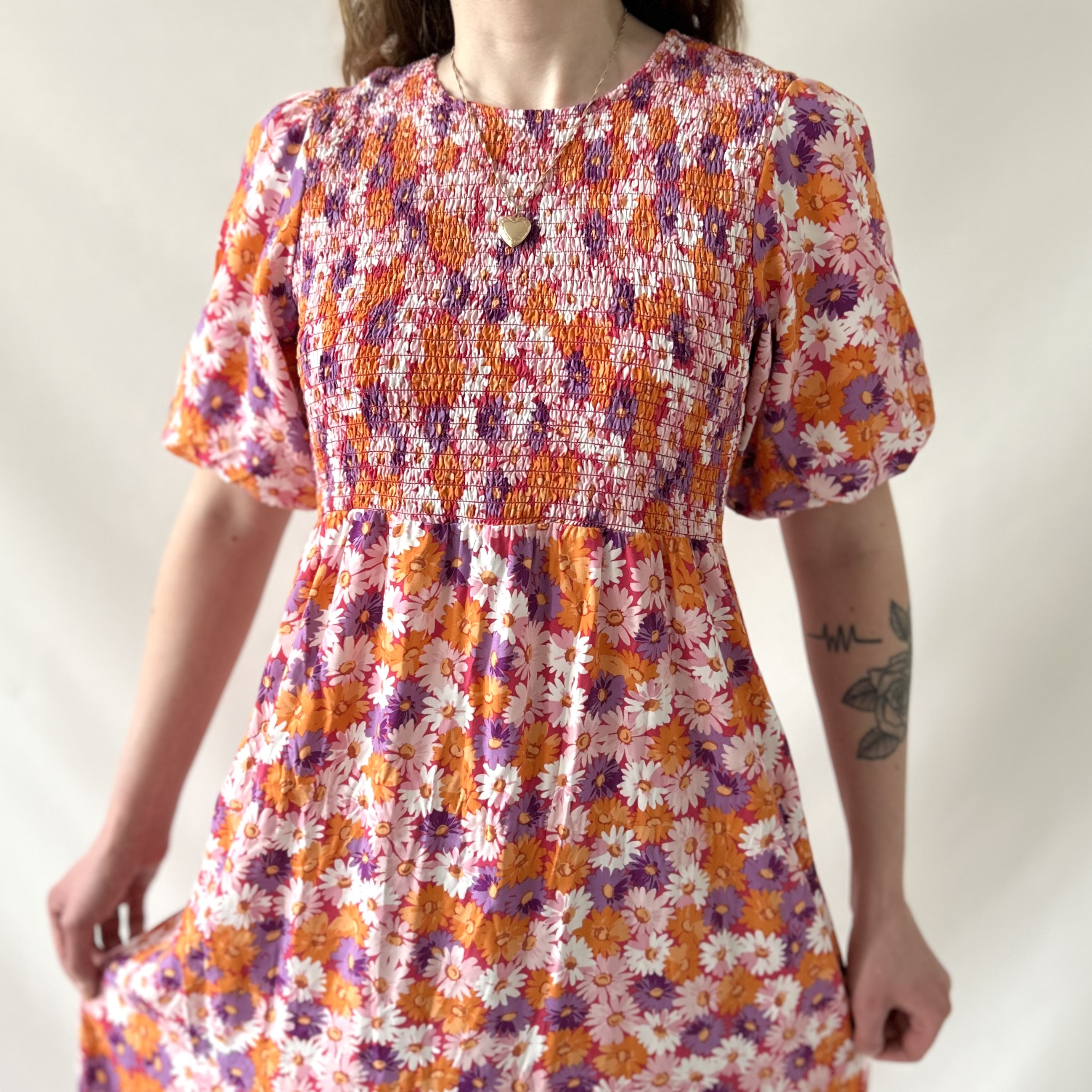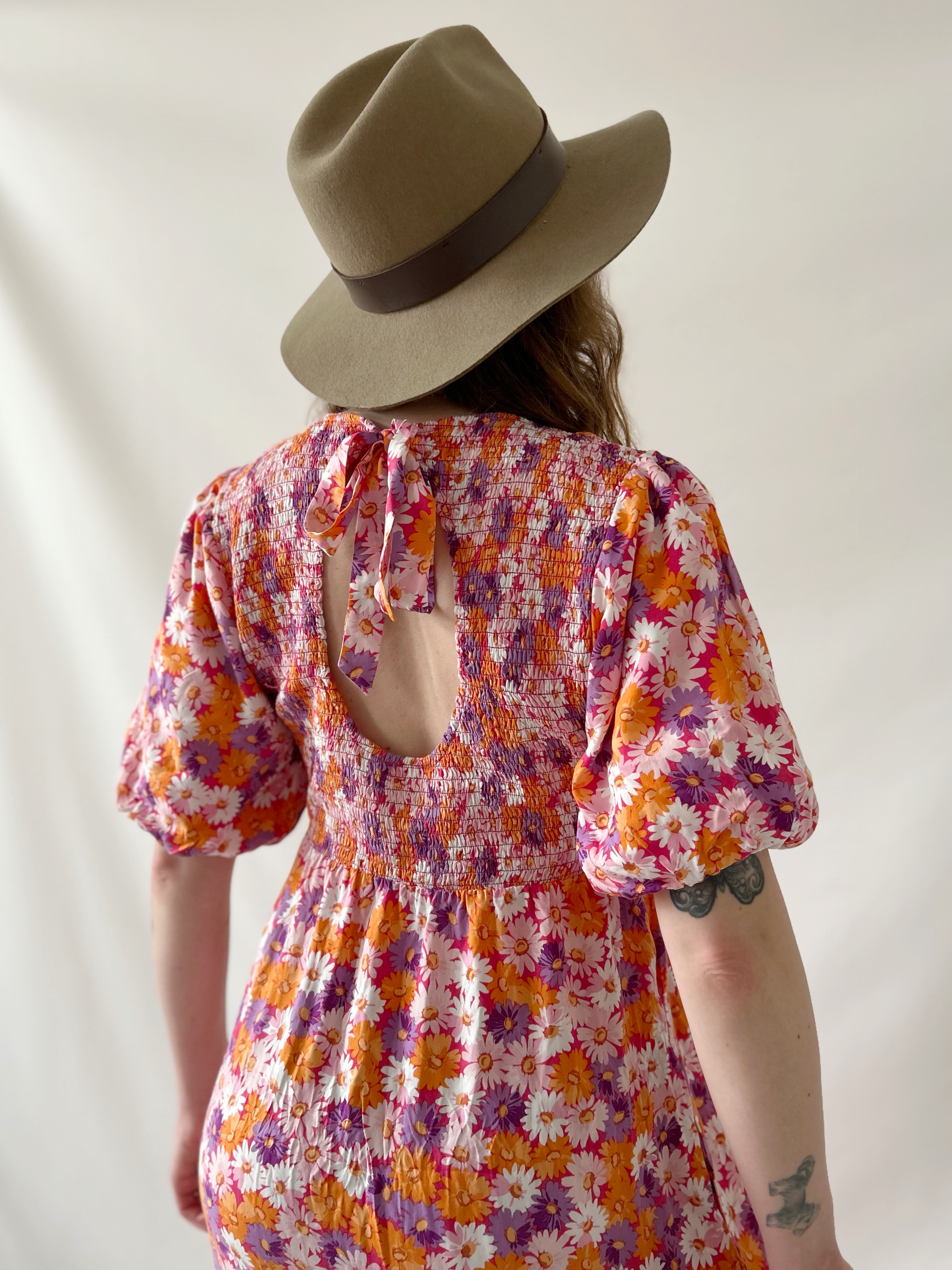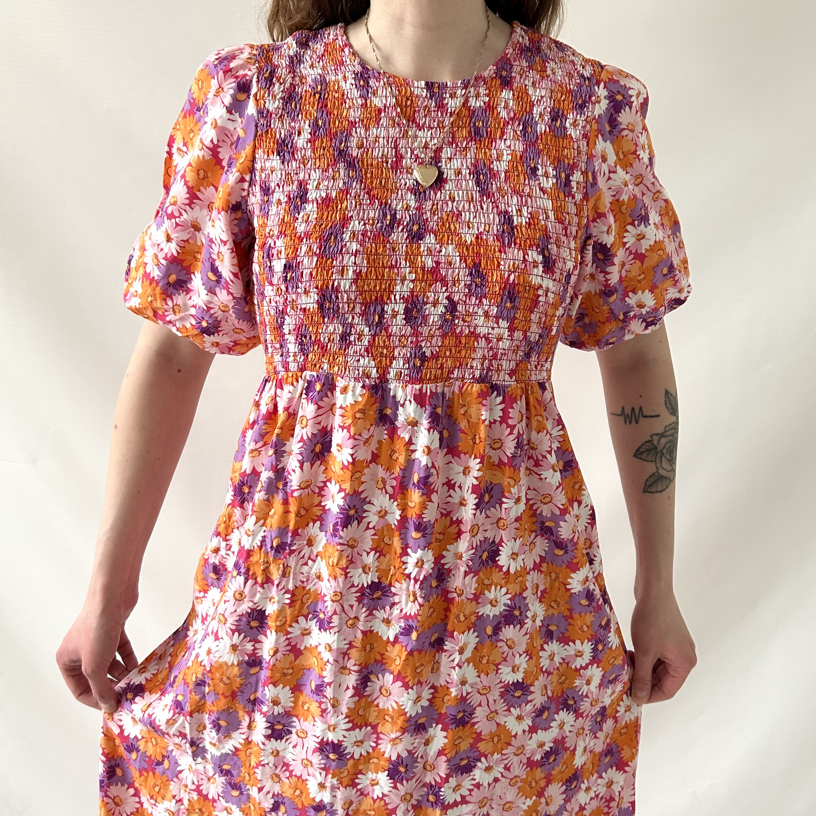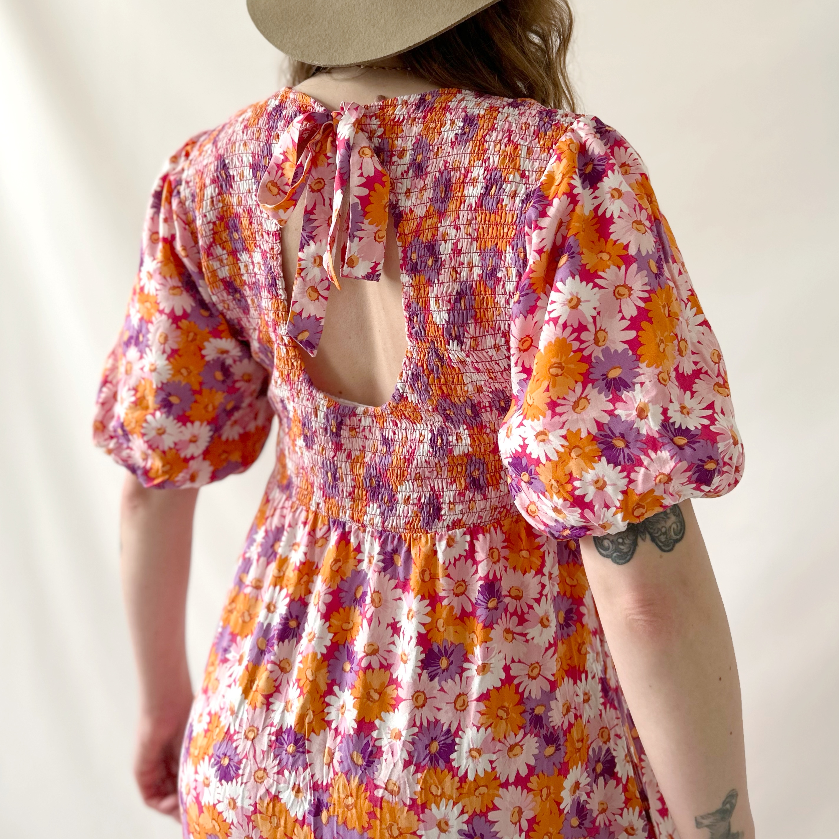 Nowa rozkloszowana retro sukienka w kolorowe kwiatki. Ma efektowne wiązanie na plecach