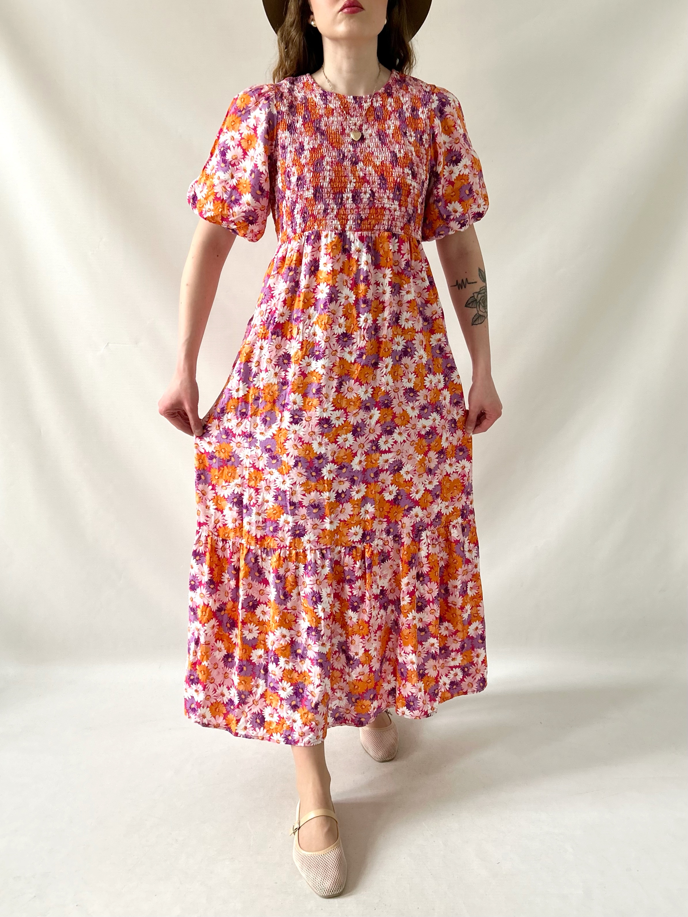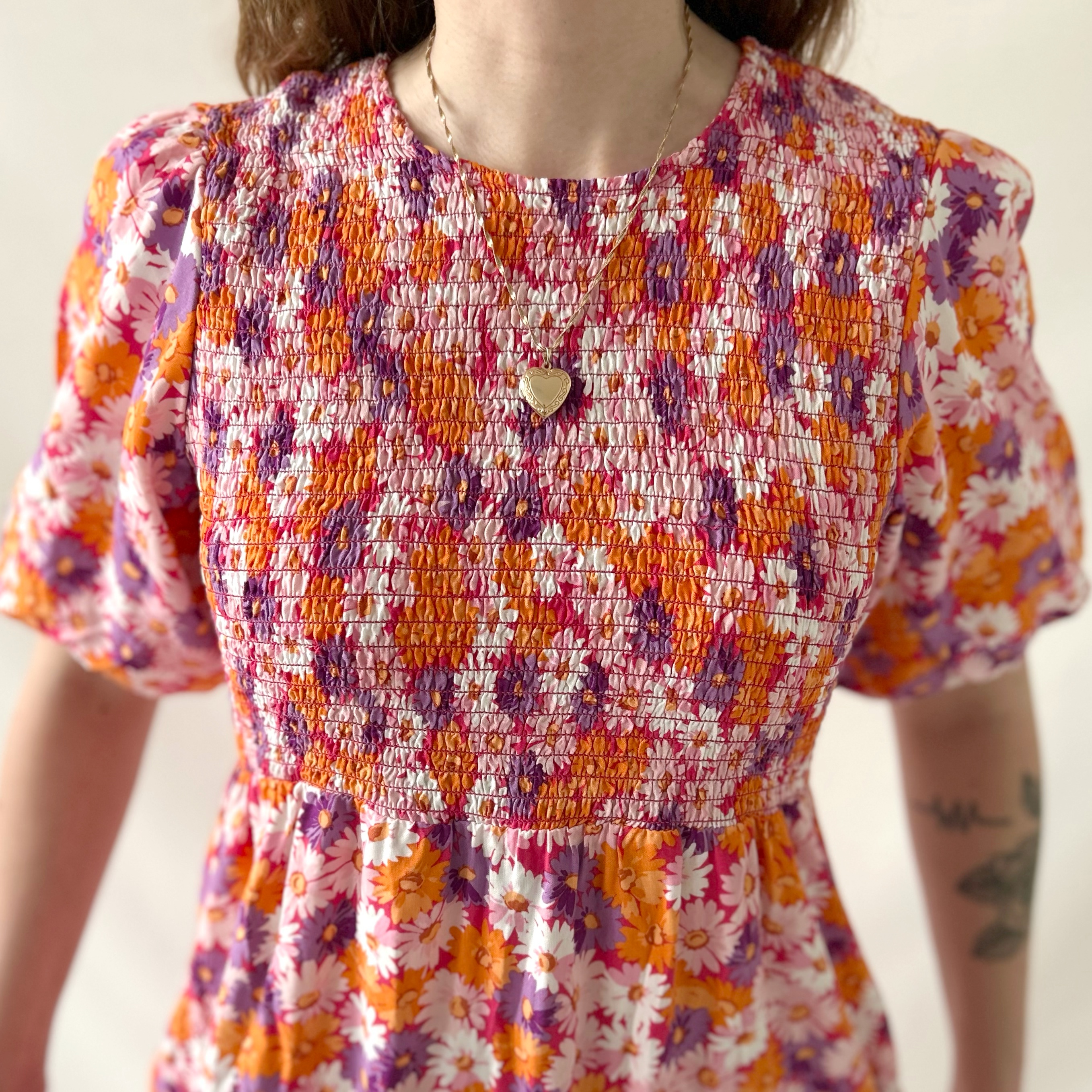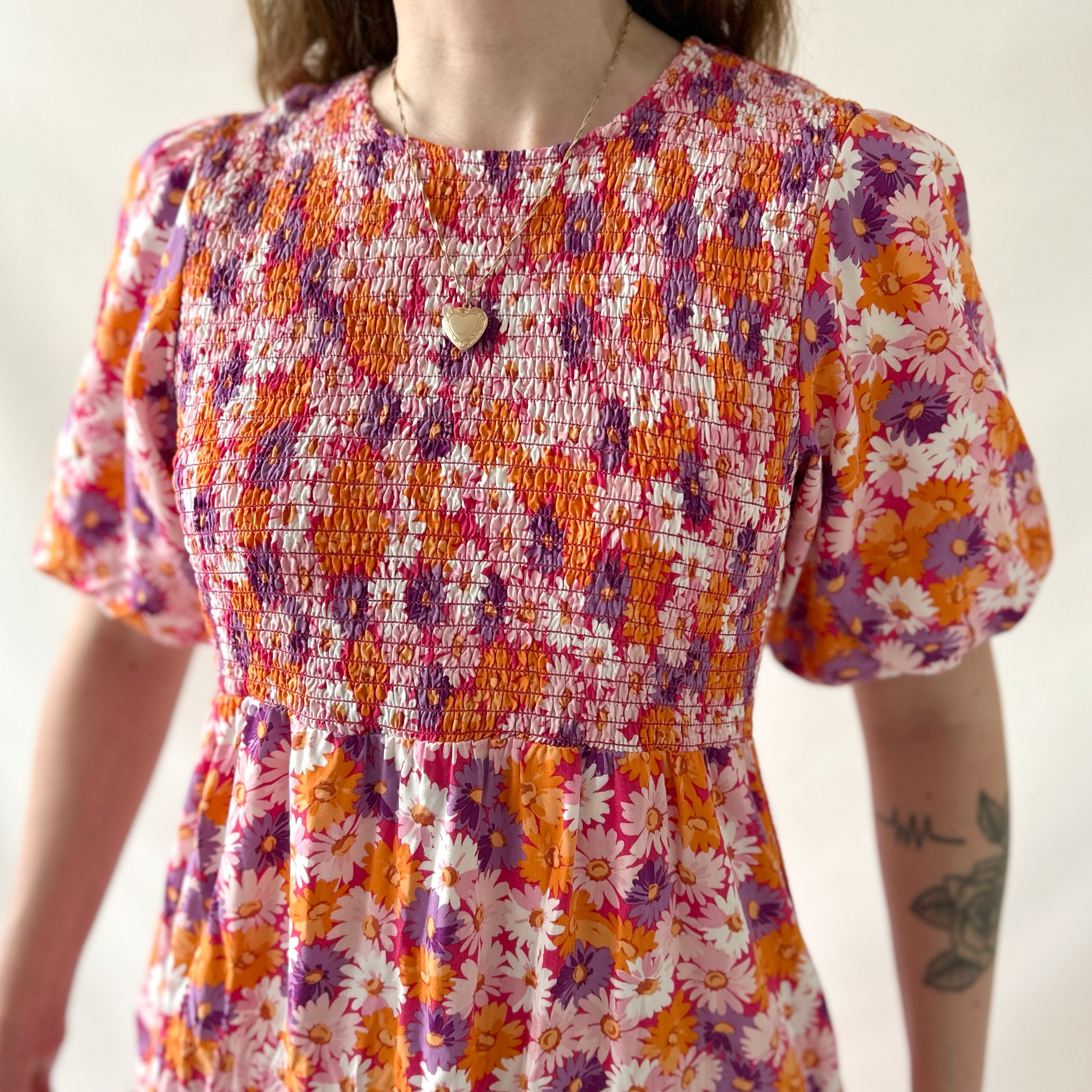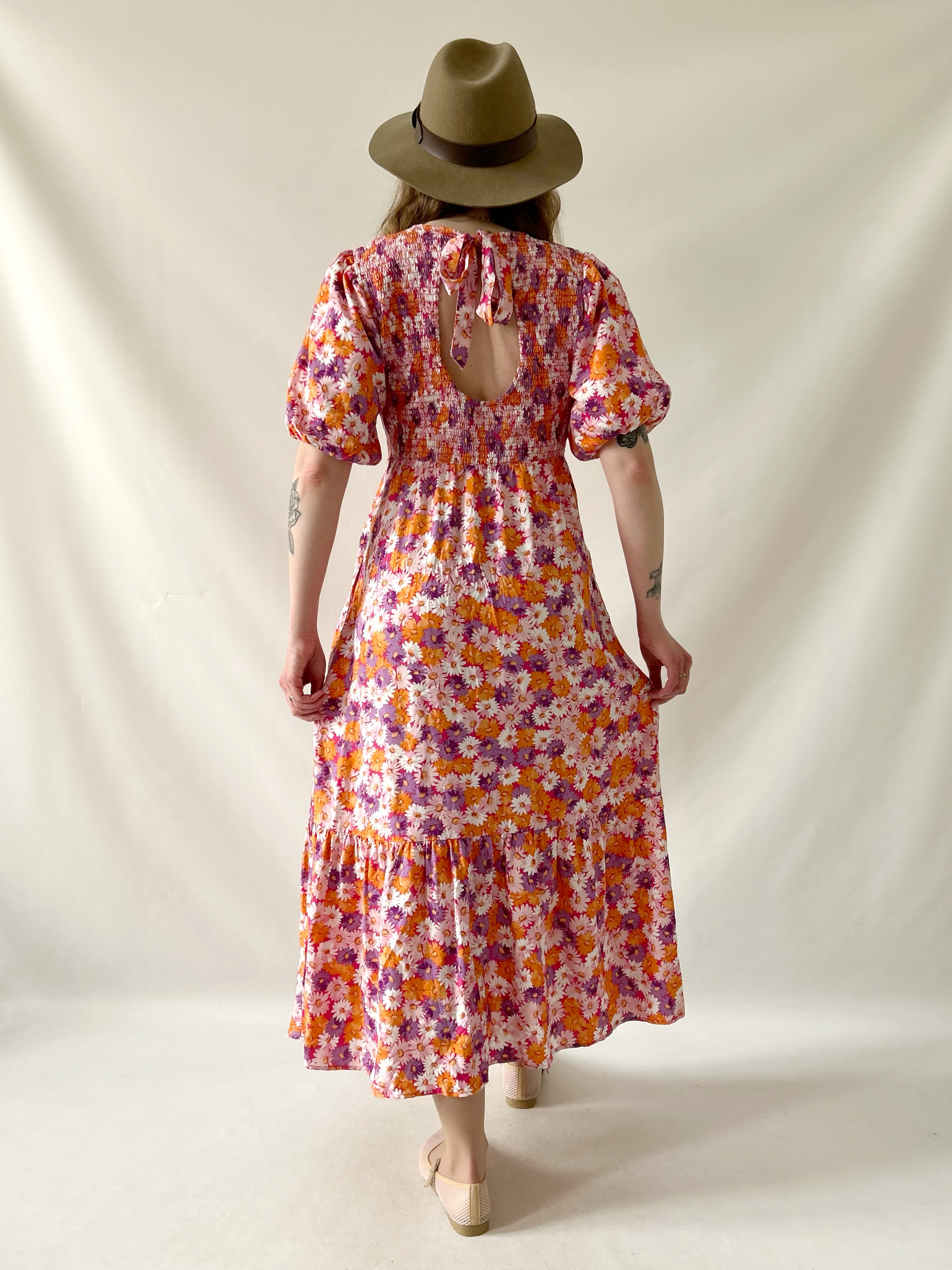 Nowa rozkloszowana retro sukienka w kolorowe kwiatki. Ma efektowne wiązanie na plecach