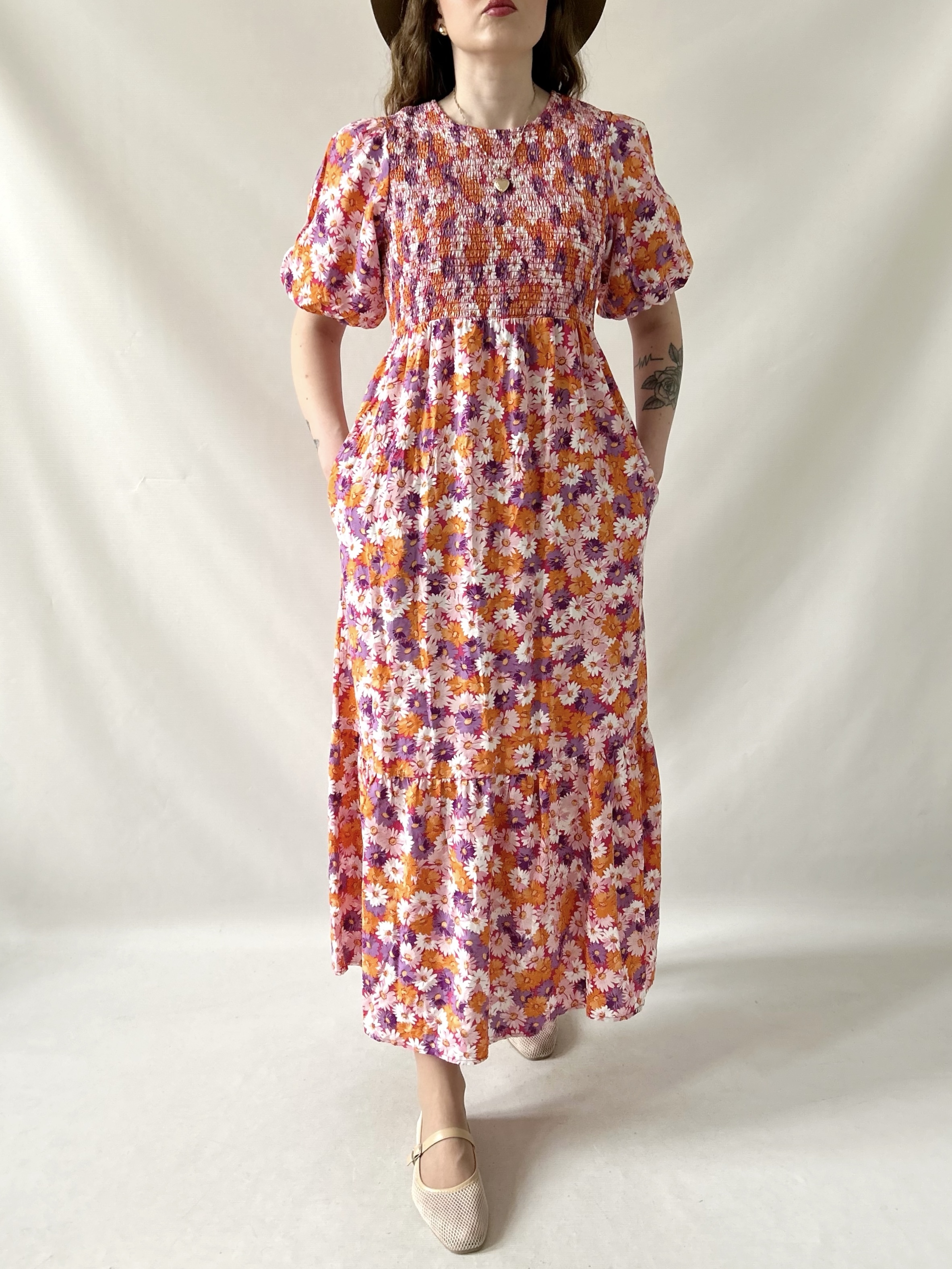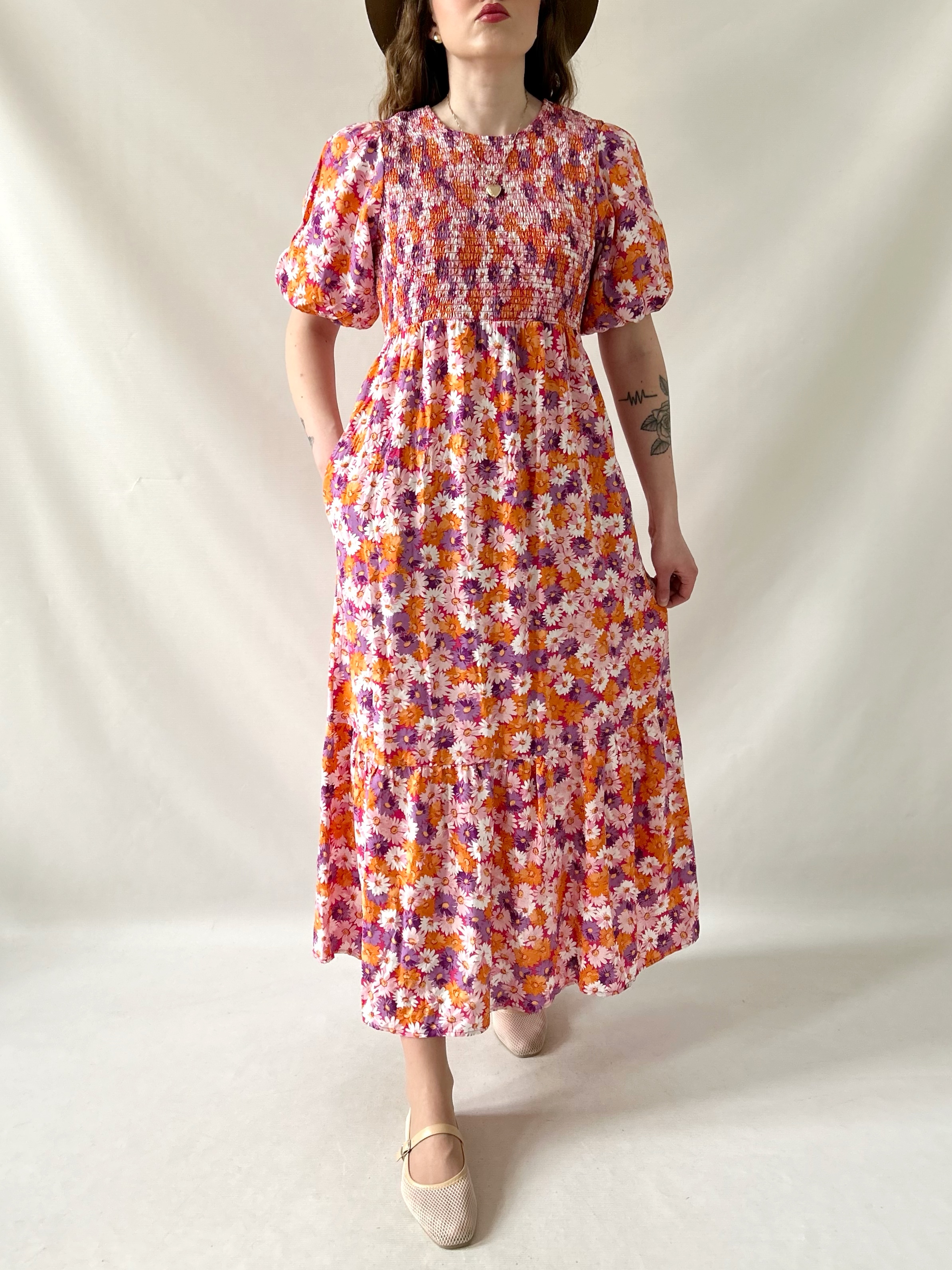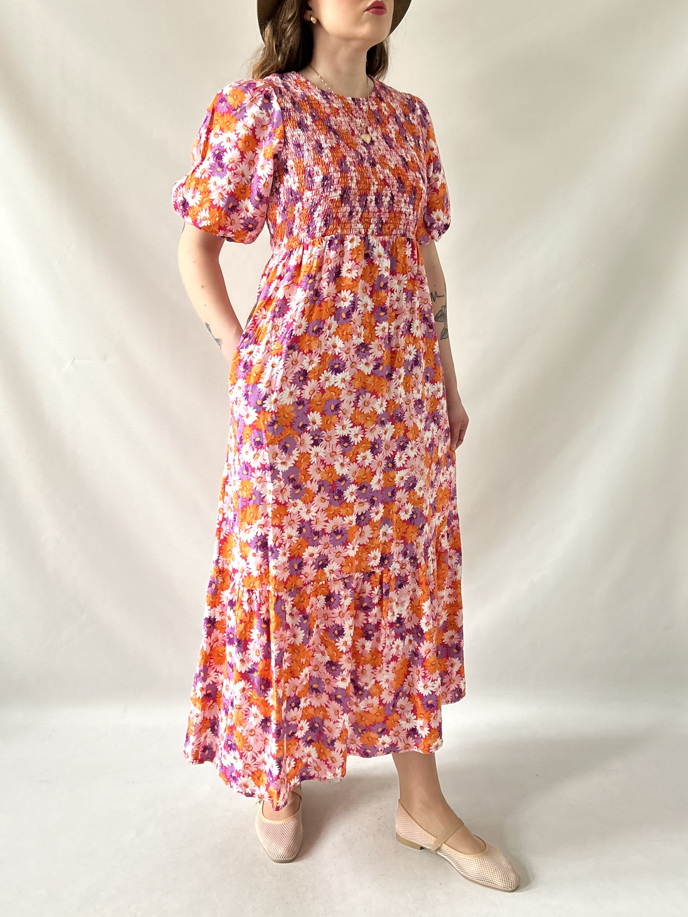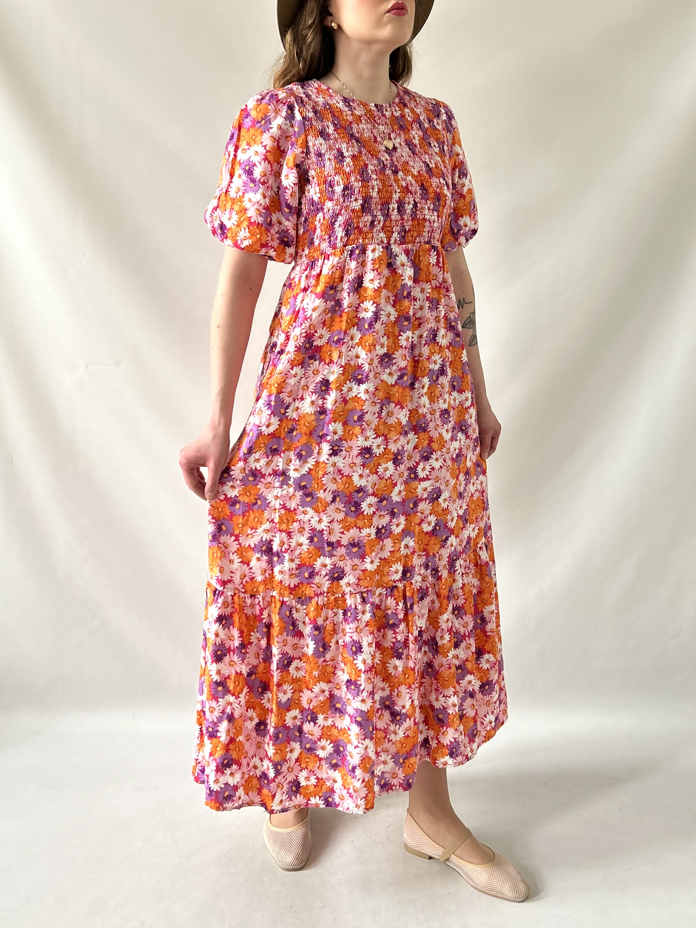 Nowa rozkloszowana retro sukienka w kolorowe kwiatki. Ma efektowne wiązanie na plecach