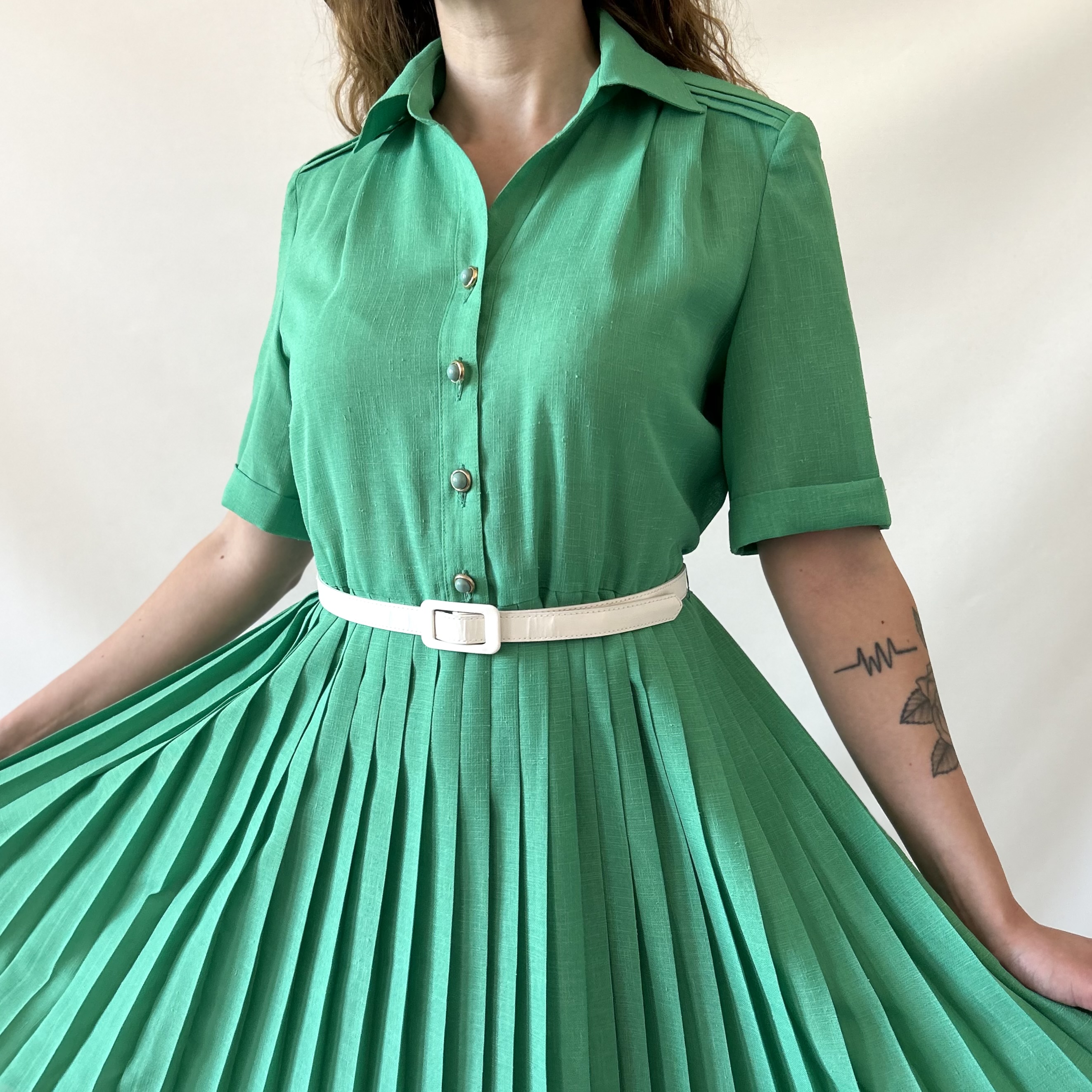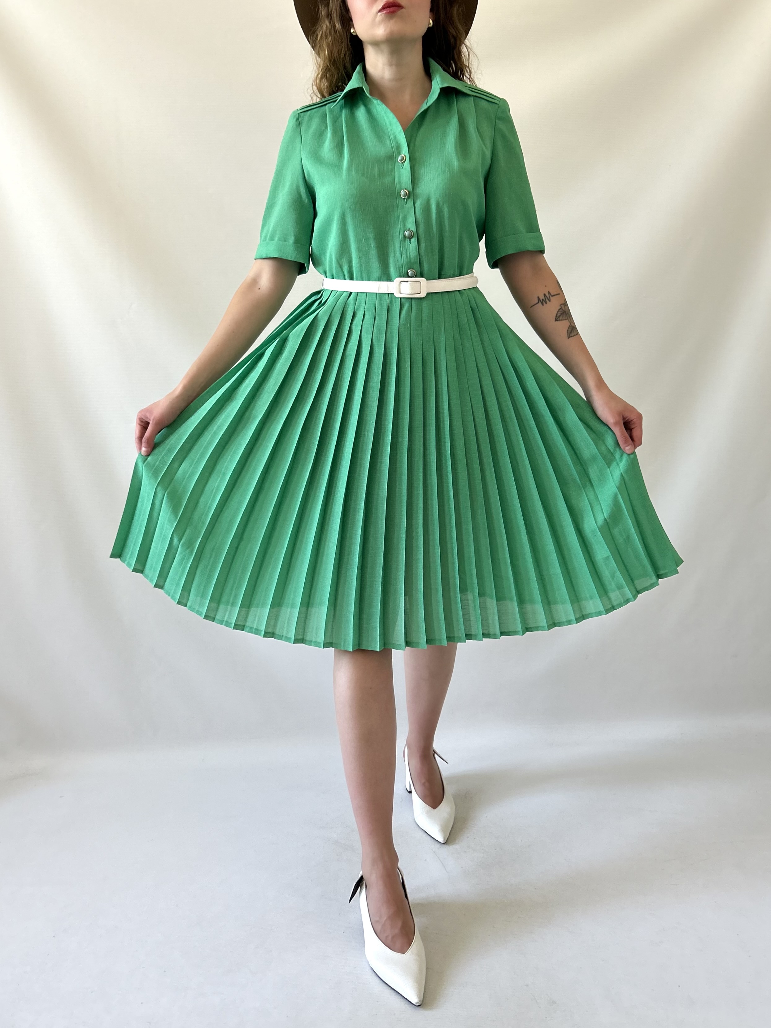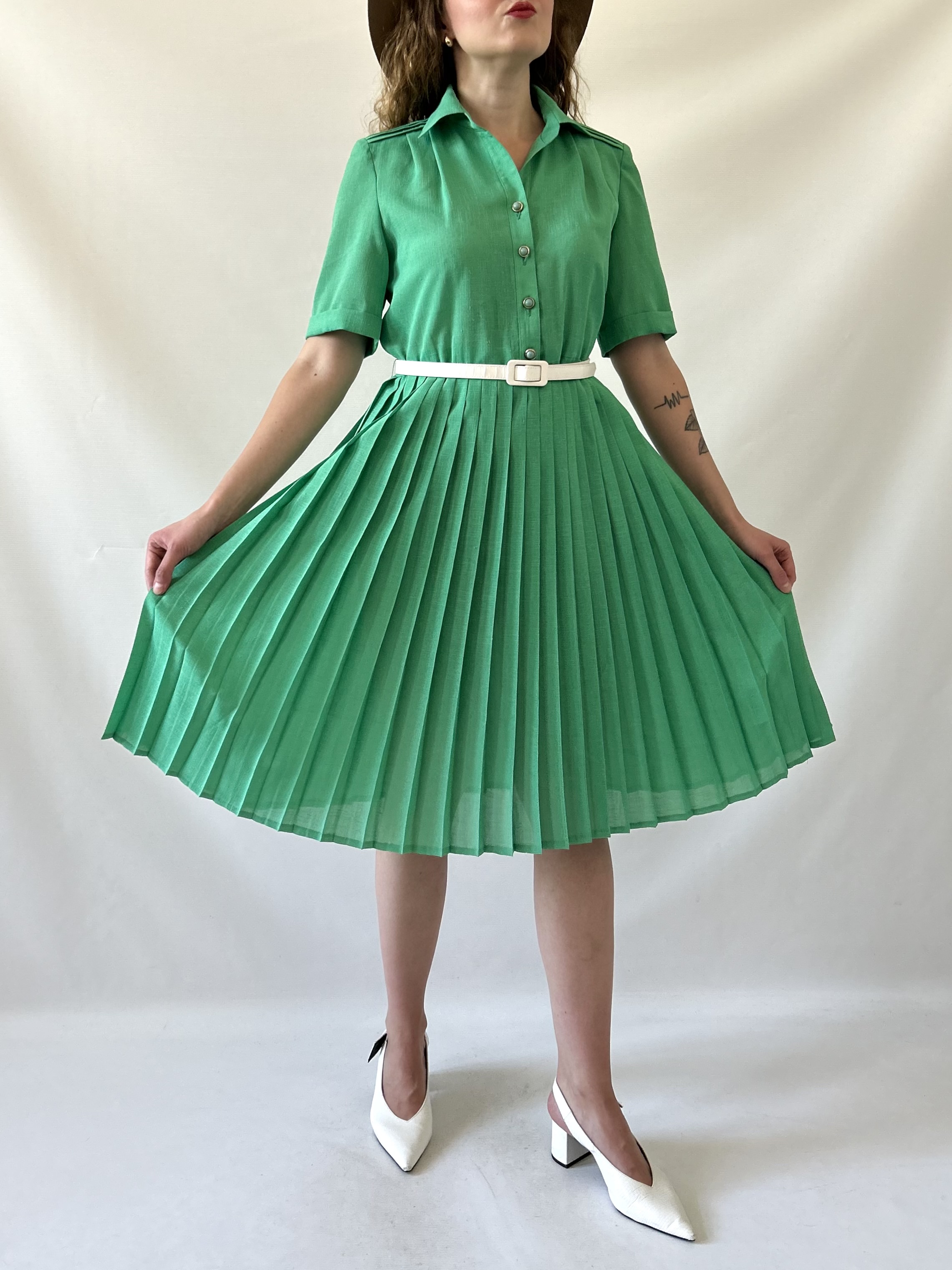 Rozkloszowana zielona plisowana francuska vintage sukienka. Ma szlufki, ale jest sprzedawana bez paska