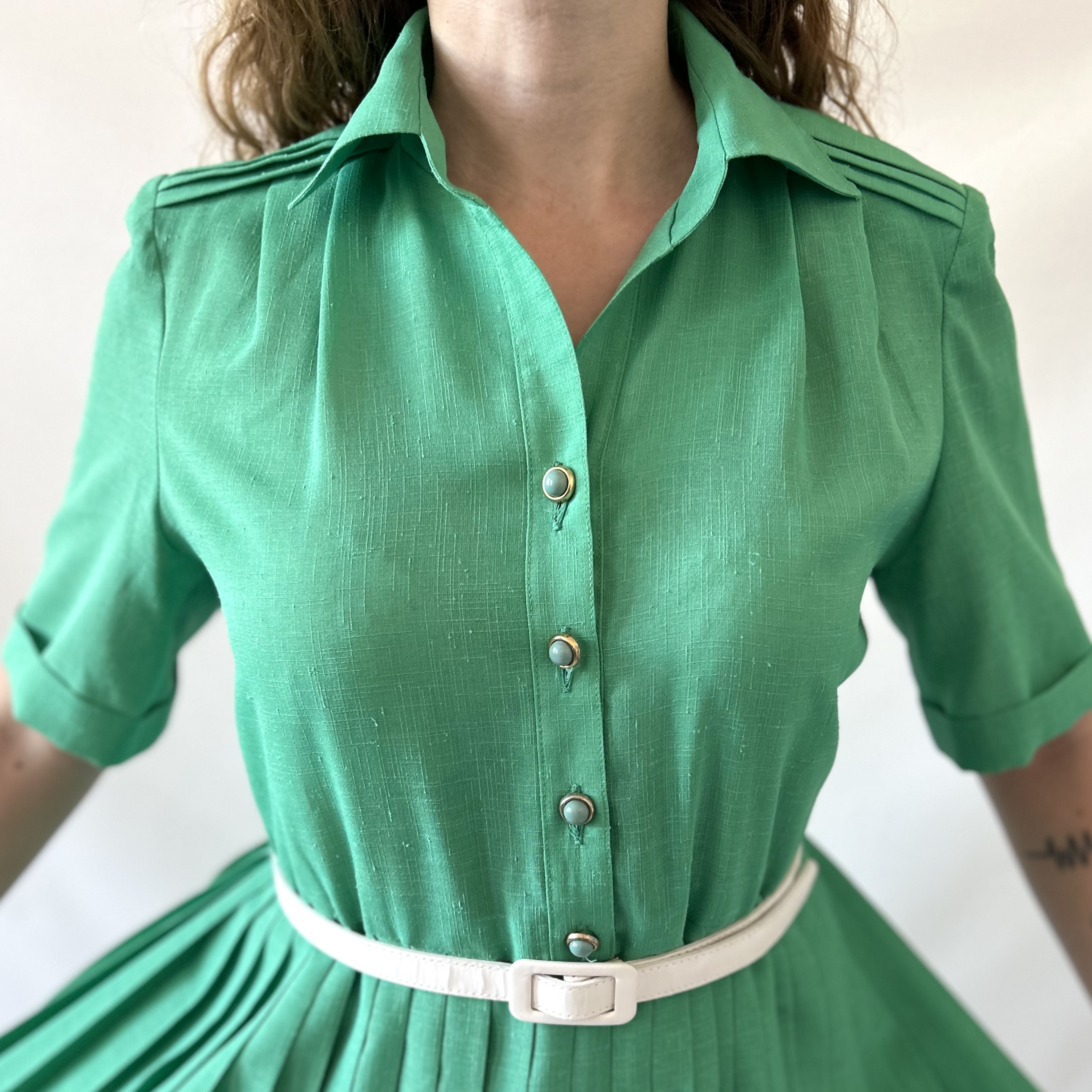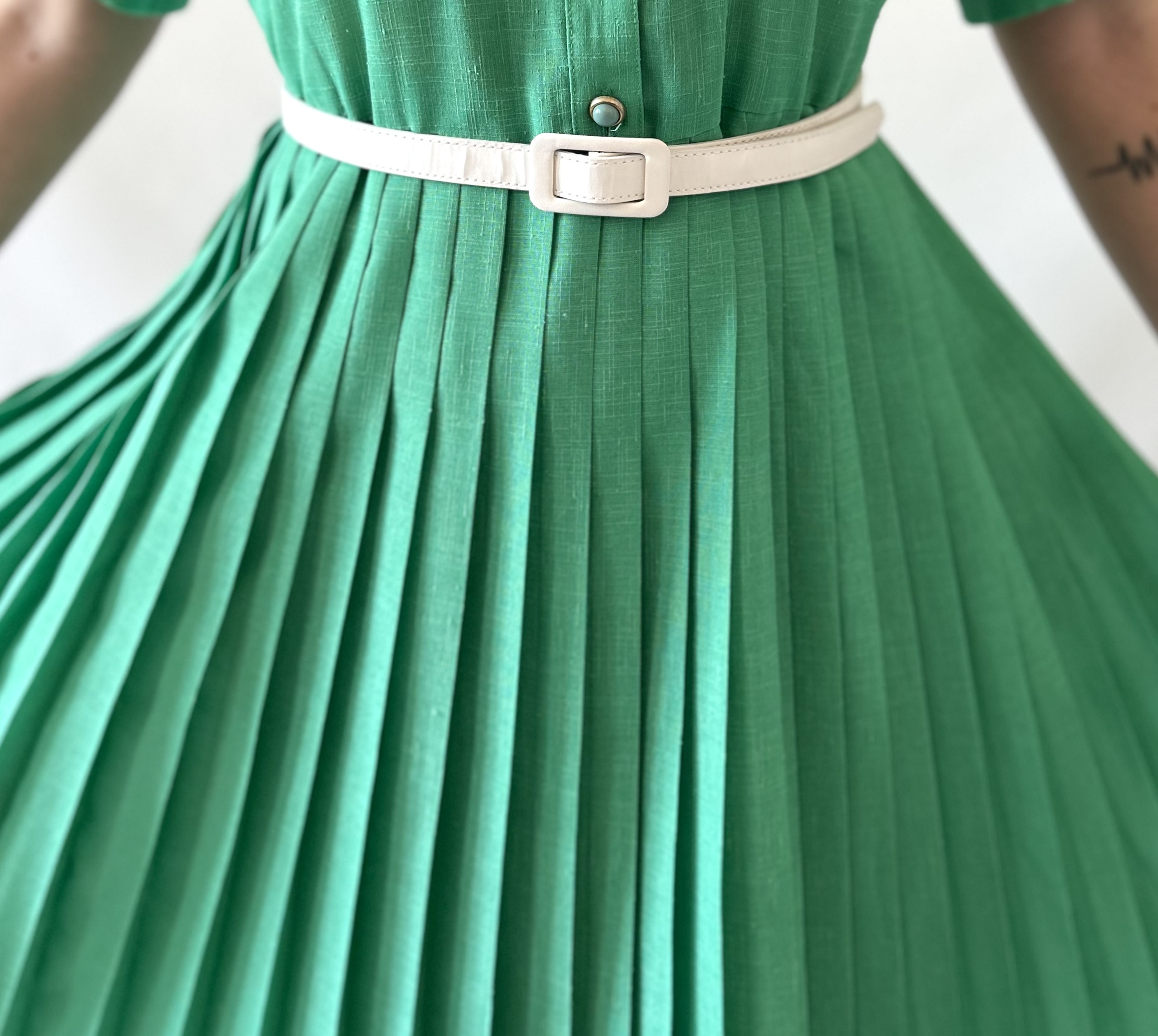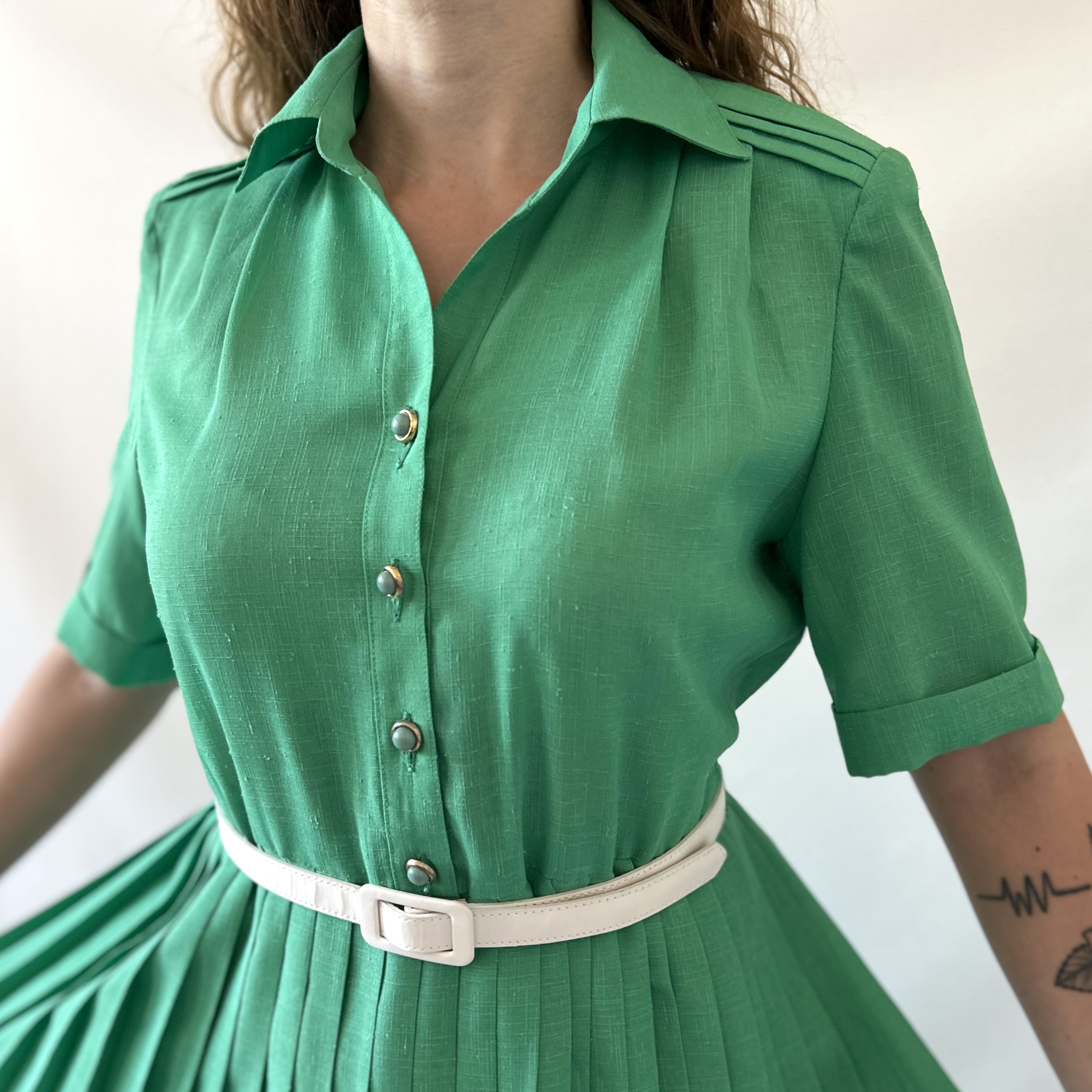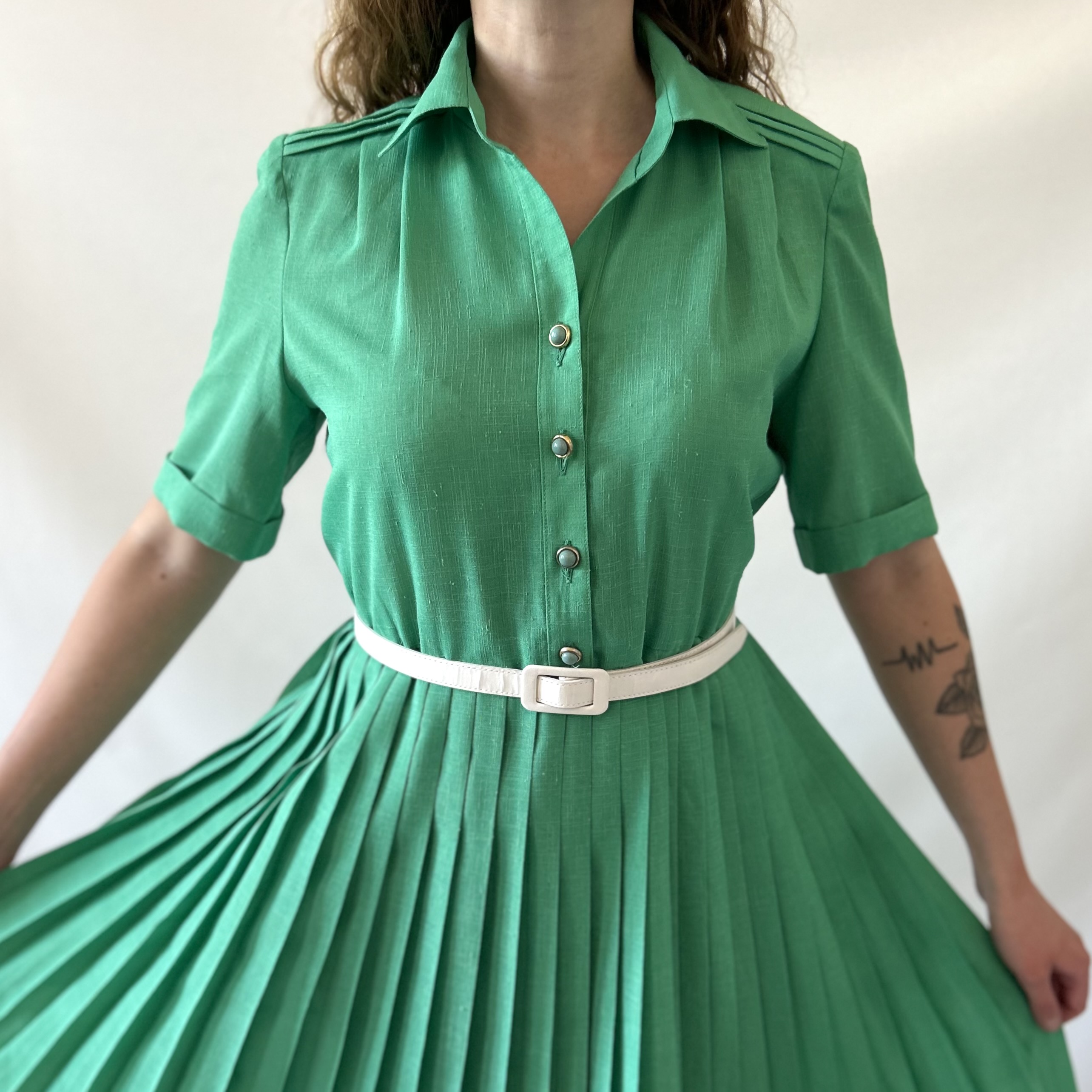 Rozkloszowana zielona plisowana francuska vintage sukienka. Ma szlufki, ale jest sprzedawana bez paska